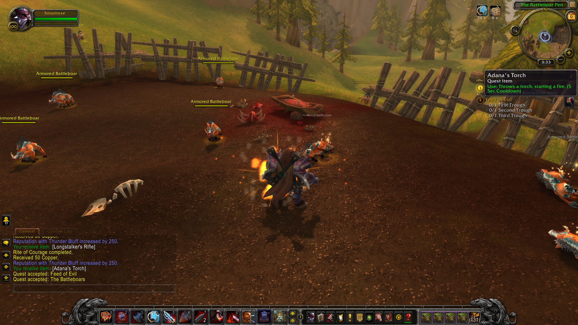 During the feed of evil quest, the torches are supposed to be thrown at the feed crates, but instead, the character just lobs them in place, forcing you to go very close to them to light them. On top of that, the torches are supposed to damage/kill the boars in a radius from the feed when you hit it, which doesn't happen.