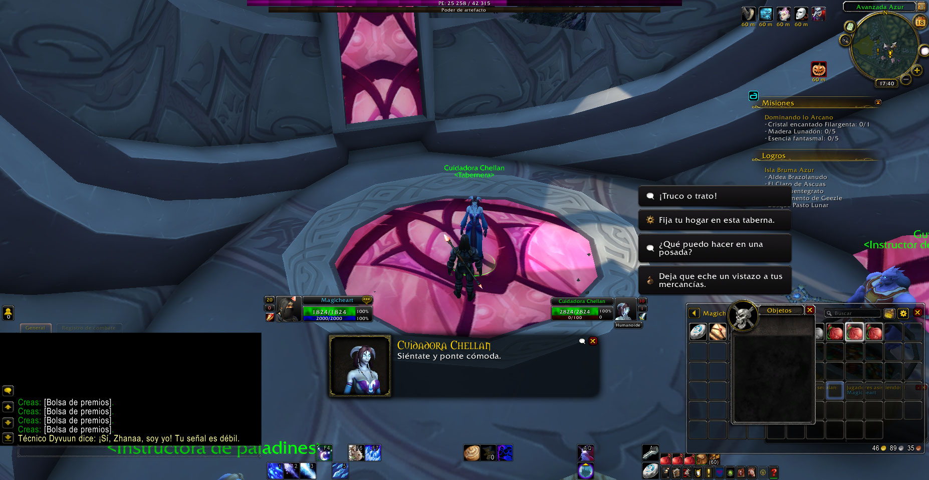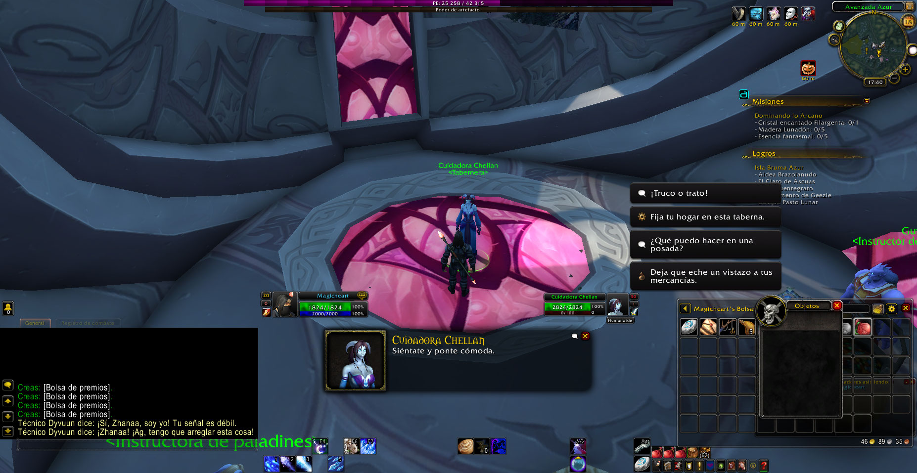 En el NPC Caregiver Chellan (de momento es el unico NPC con quien se puede hacer) se puede dar varias veces a la opción Trick or treat, cuando debería de poder hacerse cada 60min por tener el debuff, pero aun con el debuff se puede seguir obteniendo trajes y varias Treat Bag que deberian contener diversos items, en la expansión actual esta bosa ya no se obtiene, para saber sus items se debe buscar en la pagina de wow classic, también adjunto ese enlace.
