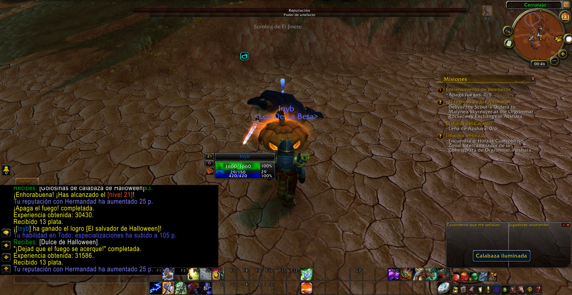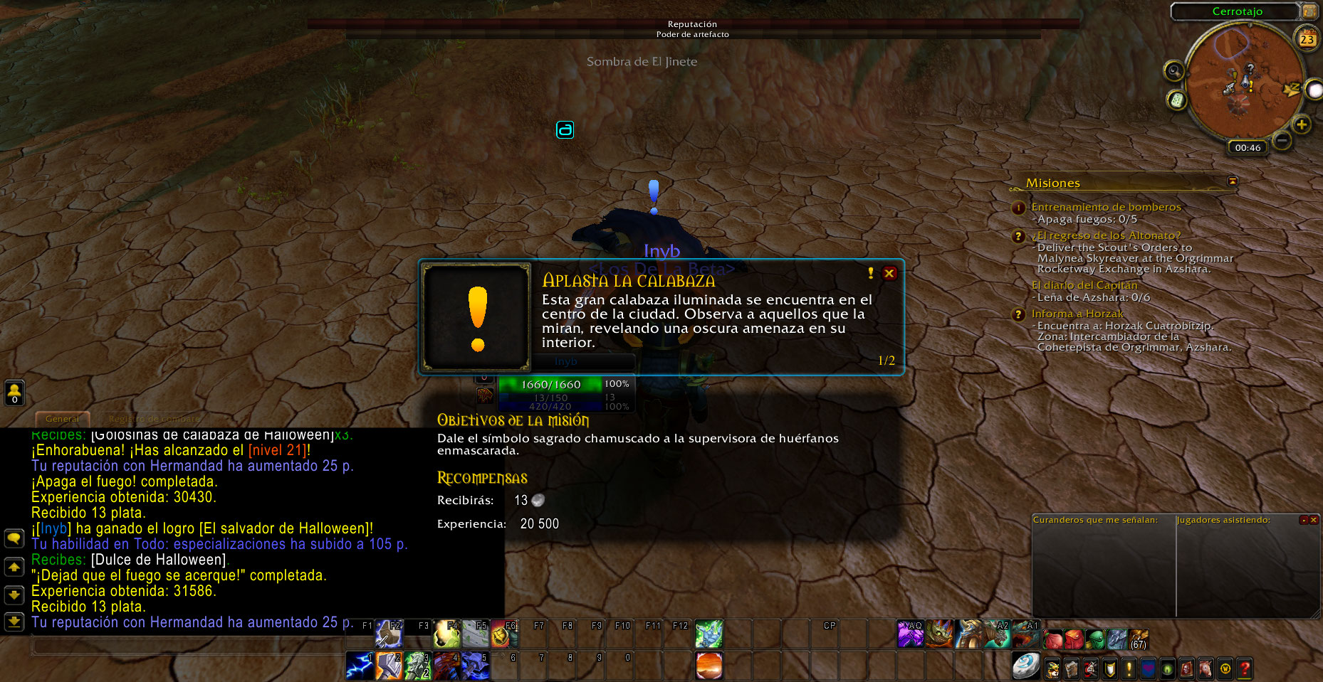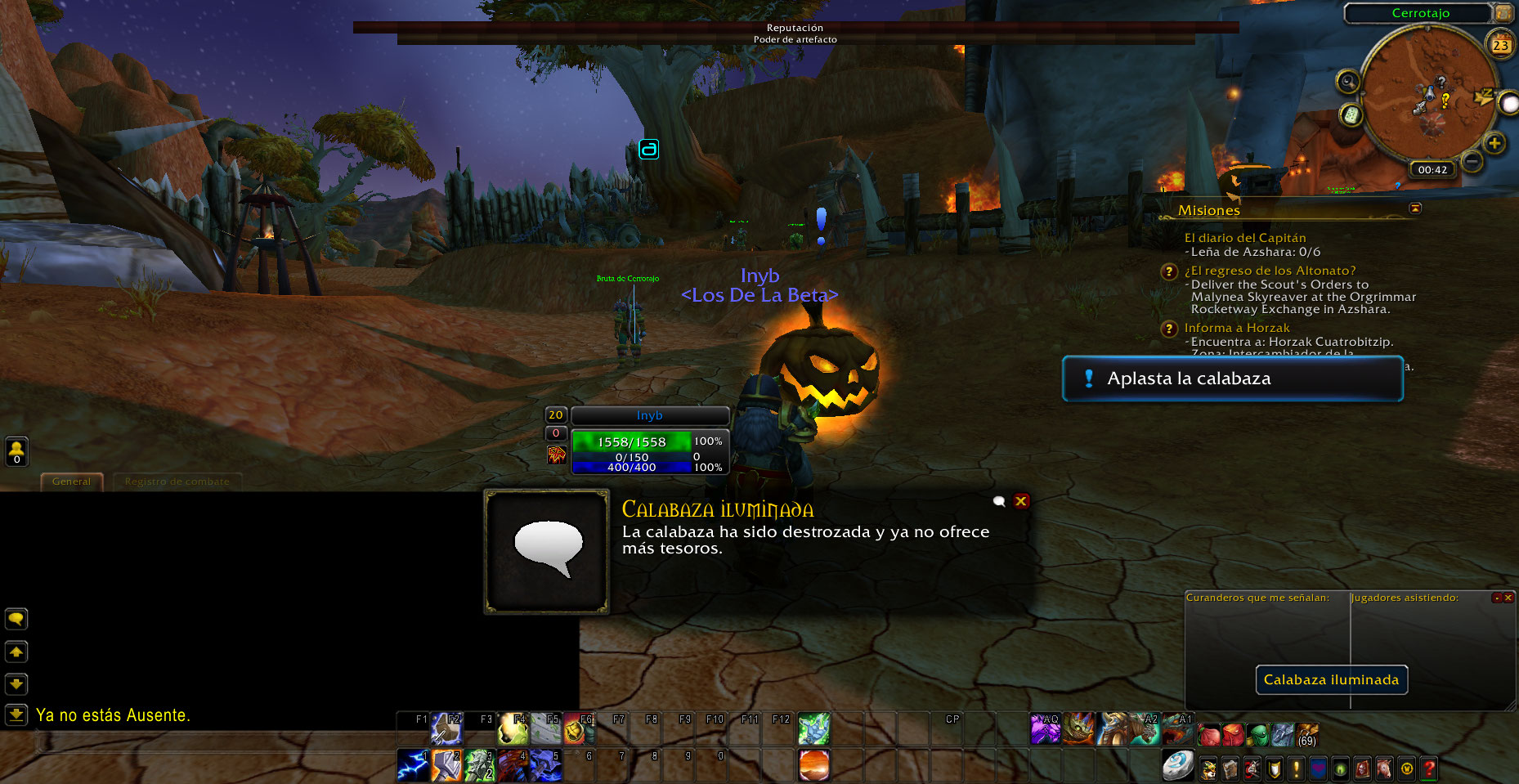 Al llegar a la zona me sorprendió ver la Large Jack-o'-Lantern, asi que acepte la misión y luego abandone porque quise hacer una screenshot, pero ya no me dejo volver a obtener la misión, pero si podia completar las quest "Let the Fires Come!" y Stop the Fires!, luego vi al NPC Shade of the Horseman (supongo los otros NPC lo mataron y por ello vi el Large Jack-o'-Lantern al llegar), lo mate y pude volver a aceptar la quest Smash the Pumpkin.