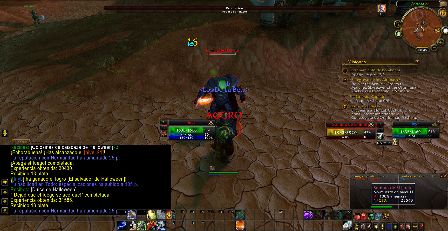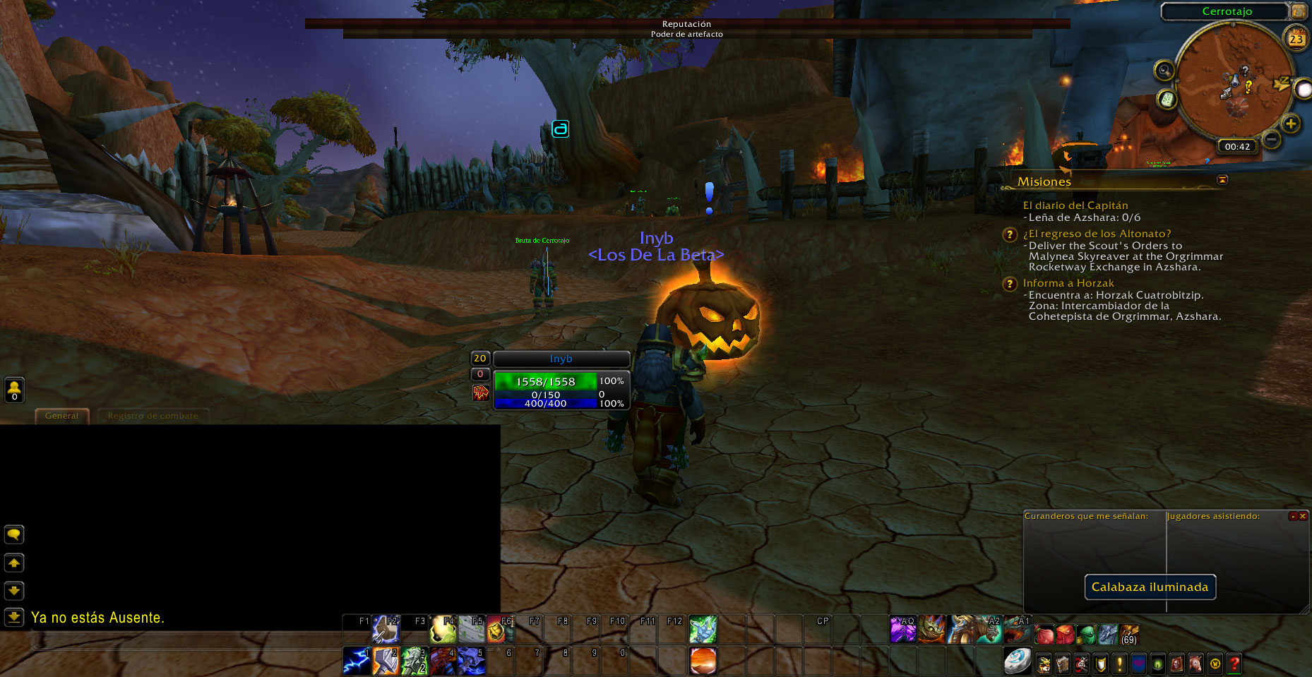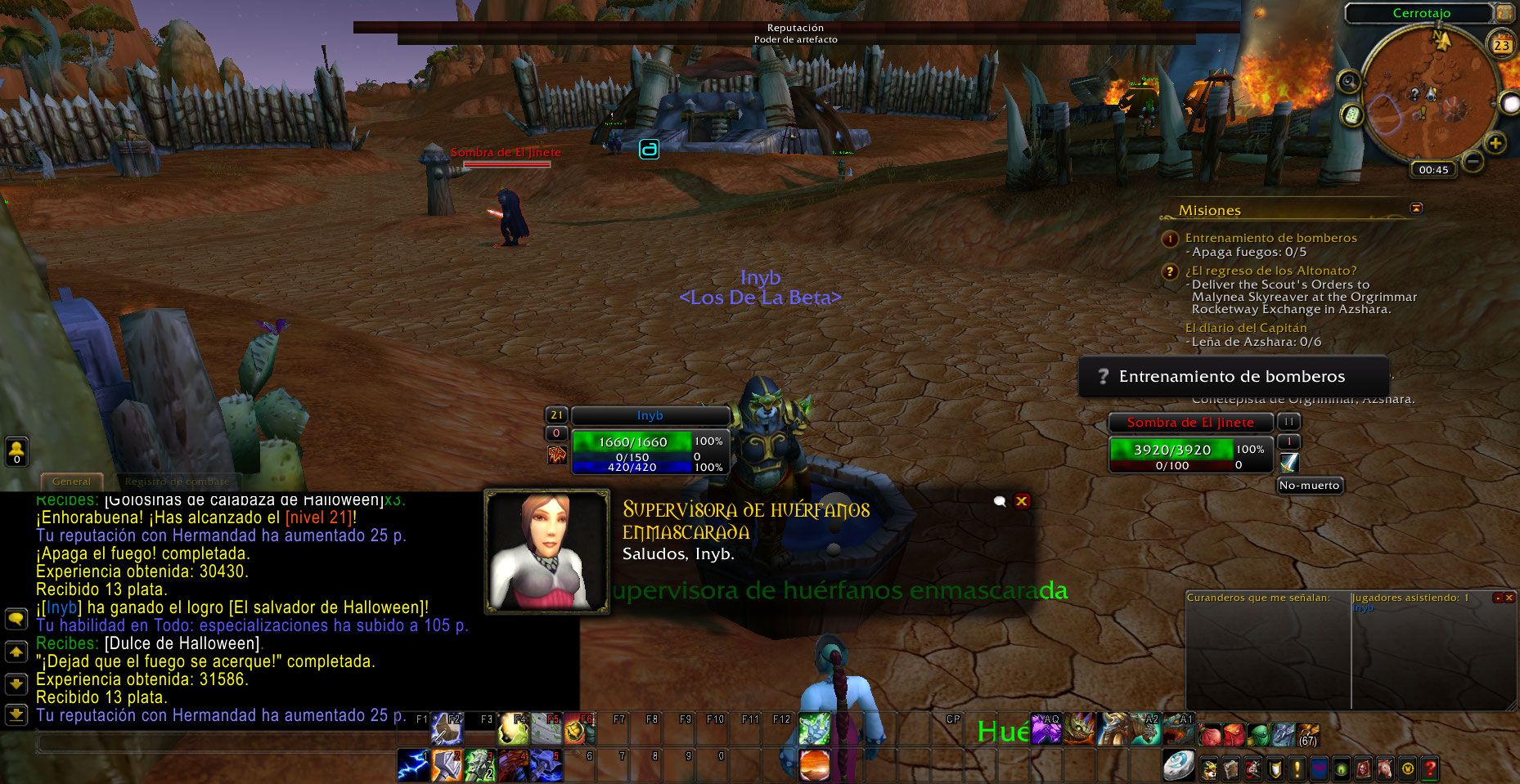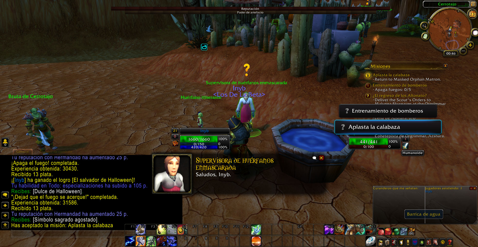Al llegar a la zona me sorprendió ver la Large Jack-o'-Lantern, asi que acepte la misión y luego abandone porque quise hacer una screenshot, pero ya no me dejo volver a obtener la misión, pero si podia completar las quest "Let the Fires Come!" y Stop the Fires!, luego vi al NPC Shade of the Horseman (supongo los otros NPC lo mataron y por ello vi el Large Jack-o'-Lantern al llegar), lo mate y pude volver a aceptar la quest Smash the Pumpkin.