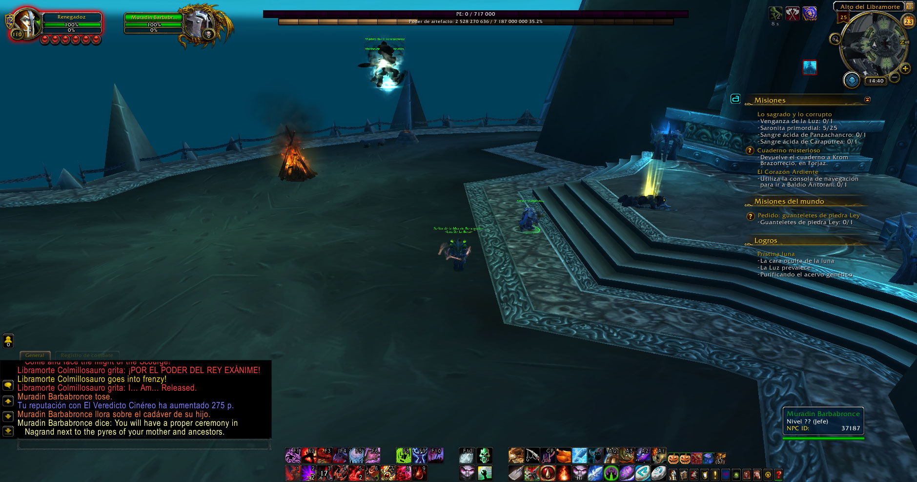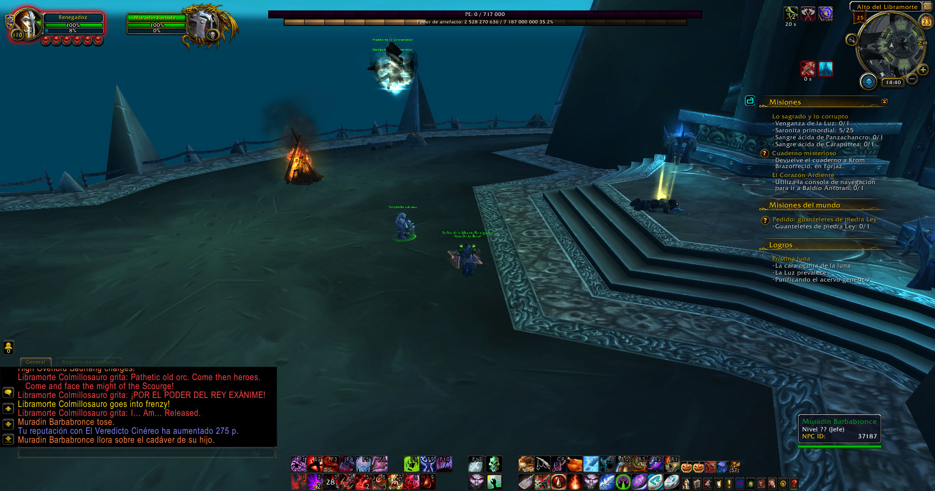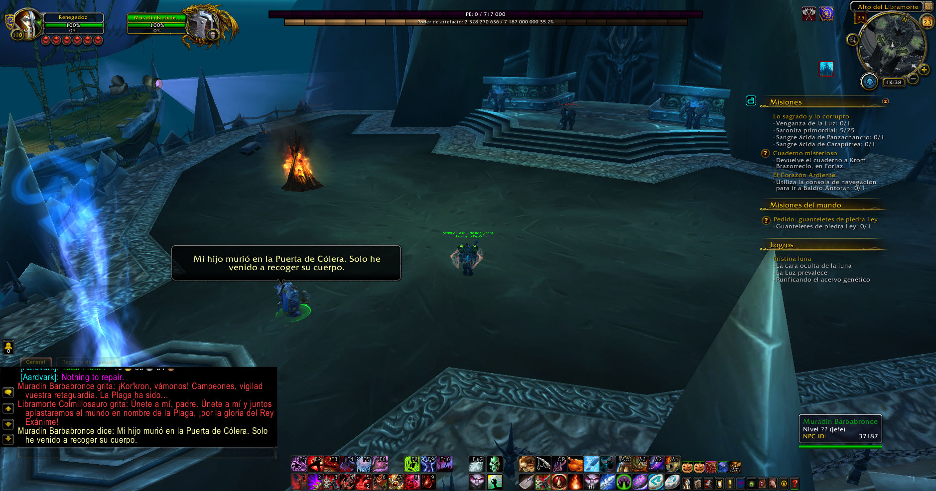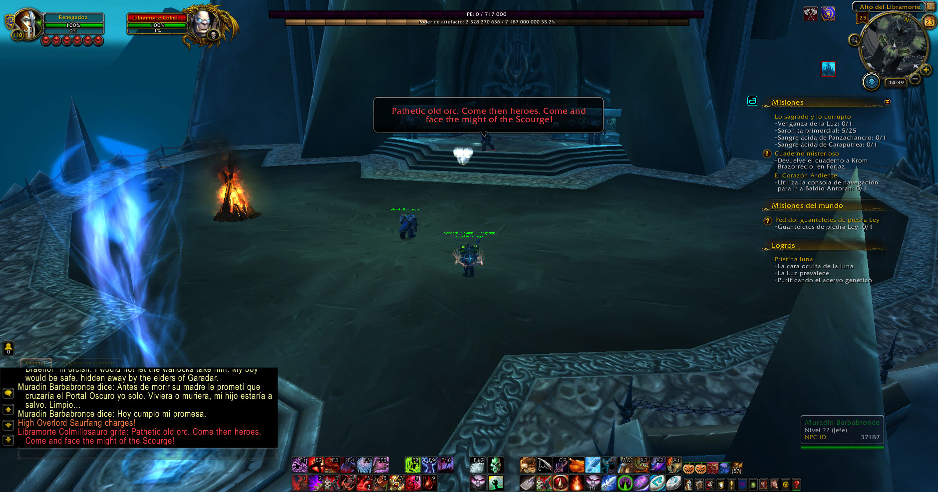 Al estar en el inicio del encuentro contra Deathbringer Saurfang siendo Alianza, el NPC que debería ser Muradin Bronzebeard (no sé cual seria, adjunto dos enlaces de los posibles NPC ID que debería ser según busque) en verdad es High Overlord Saurfang, lo saque por la ID que muestra al seleccionarlo y los diálogos que tienen no corresponden a la Alianza, aparte que están en ingles y español, adjunto un enlace donde se ve como es.