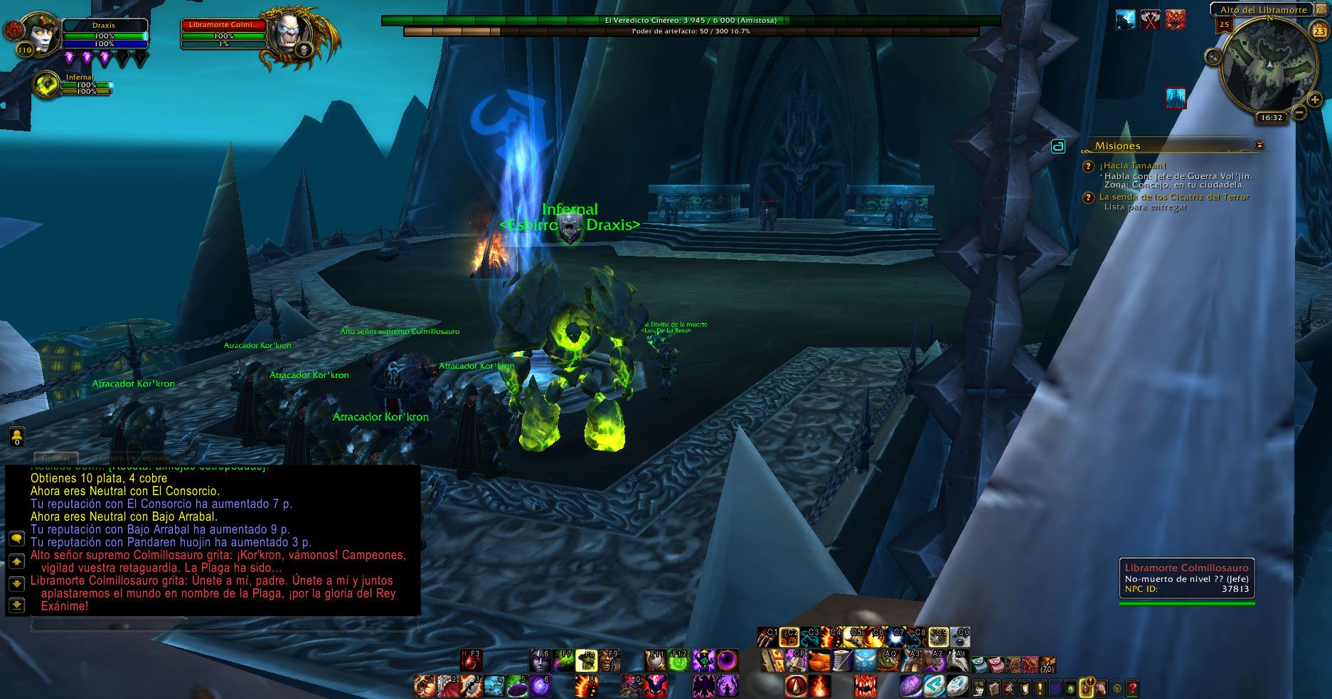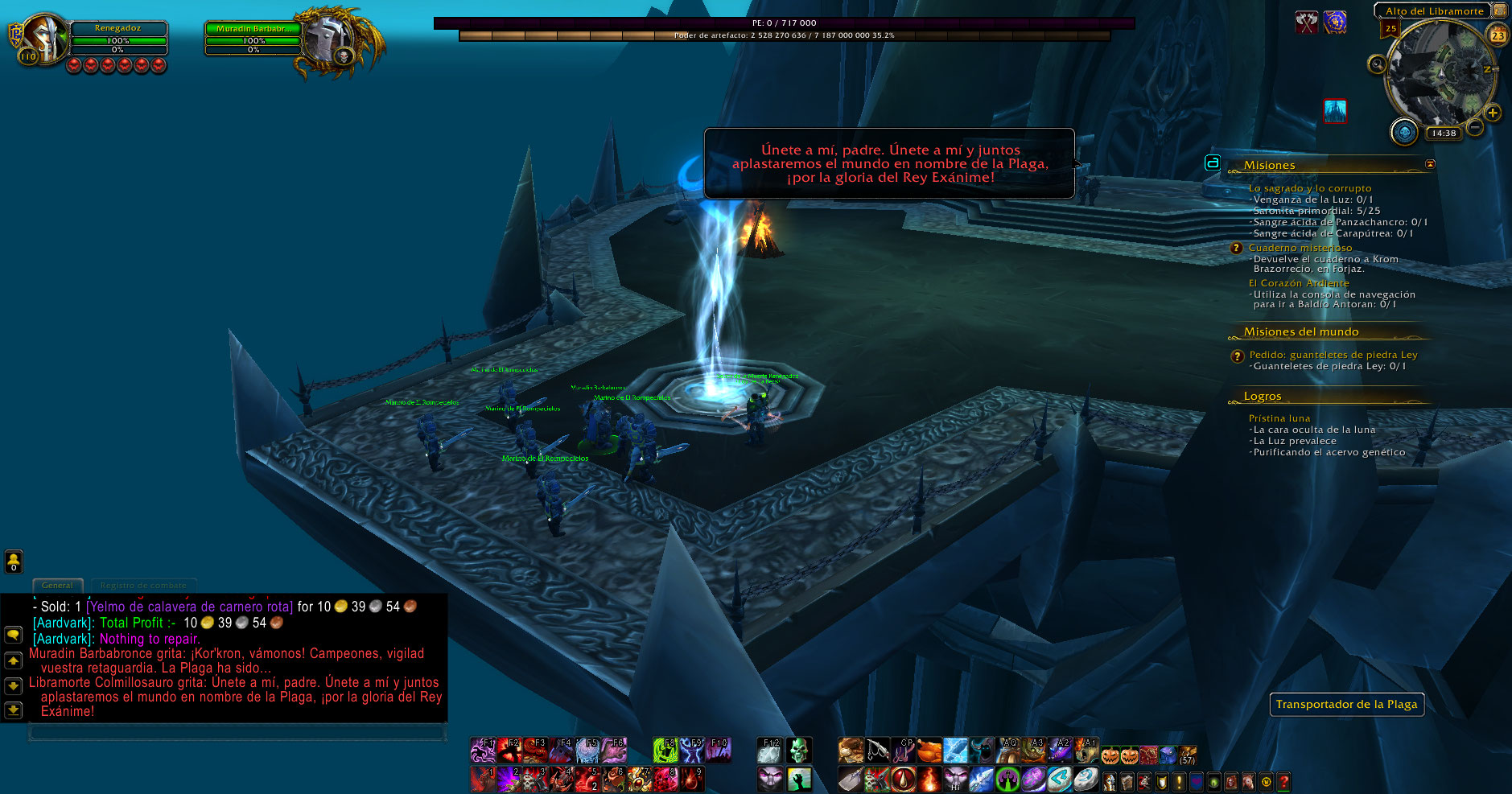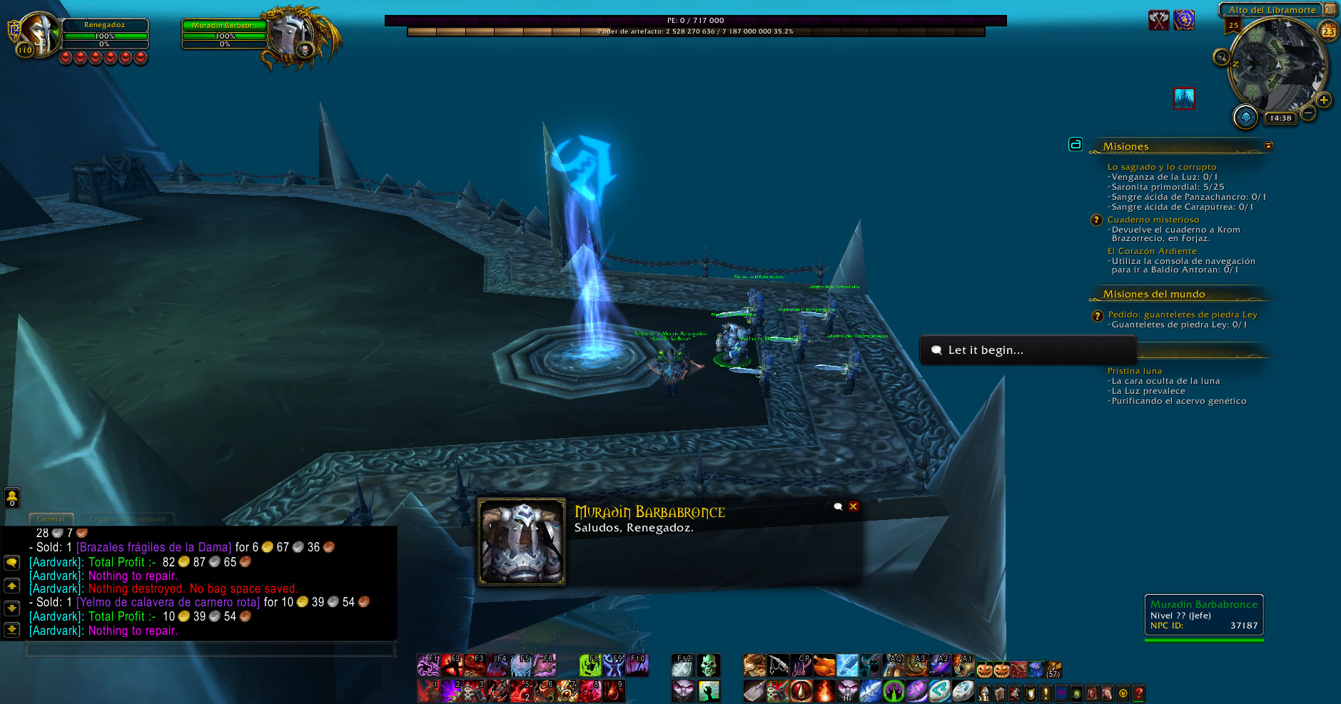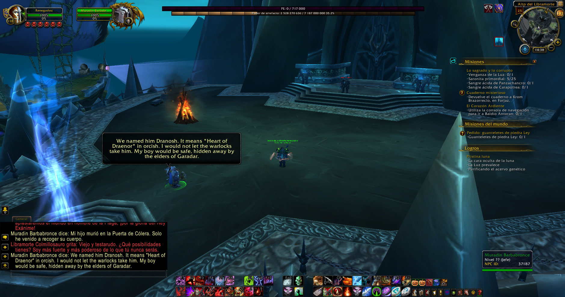 Al estar en el inicio del encuentro contra Deathbringer Saurfang siendo Alianza, el NPC que debería ser Muradin Bronzebeard (no sé cual seria, adjunto dos enlaces de los posibles NPC ID que debería ser según busque) en verdad es High Overlord Saurfang, lo saque por la ID que muestra al seleccionarlo y los diálogos que tienen no corresponden a la Alianza, aparte que están en ingles y español, adjunto un enlace donde se ve como es.