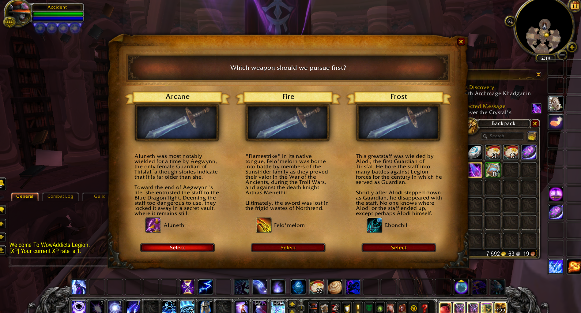 Otros magos en el server ya tienen las 3 armas y han hecho todos los scenarios sin problema. En tu captura solo veo que acabas de loguear, ni sale que hayas completado alguna quest si quiera. Y se ve que el npc te da la opcion de hacer los 3 scenarios para las armas lo que significa que aun no cogiste y completaste ninguno. Te recomiendo mirar una guia en youtube de como hacerlo si no sabes y en caso de que creas que esta mal crea un nuevo reporte con un enlace a wowhead con la id de la quest ultima que hiciste y explicando que hiciste y como fallo para revisarlo en caso de que sea necesario o ayudarte con ello.